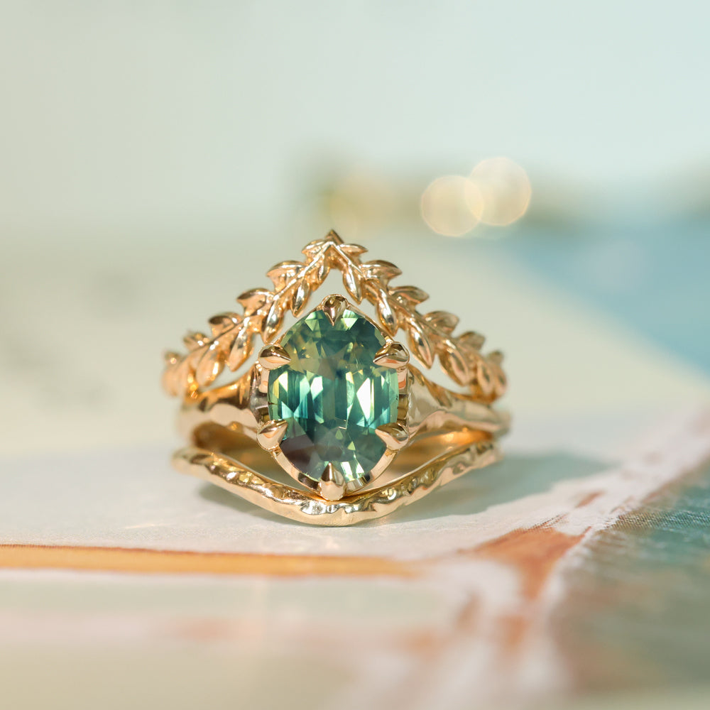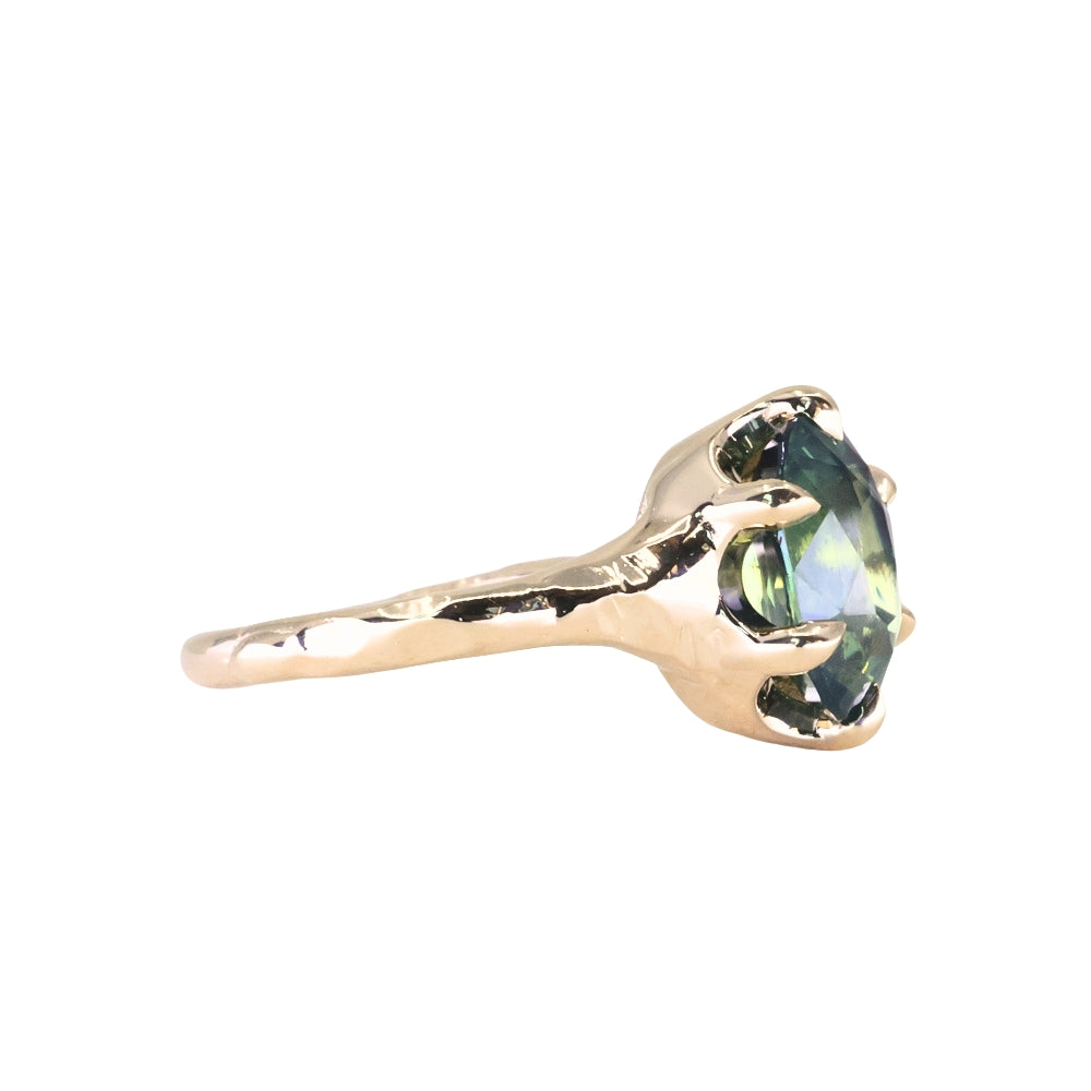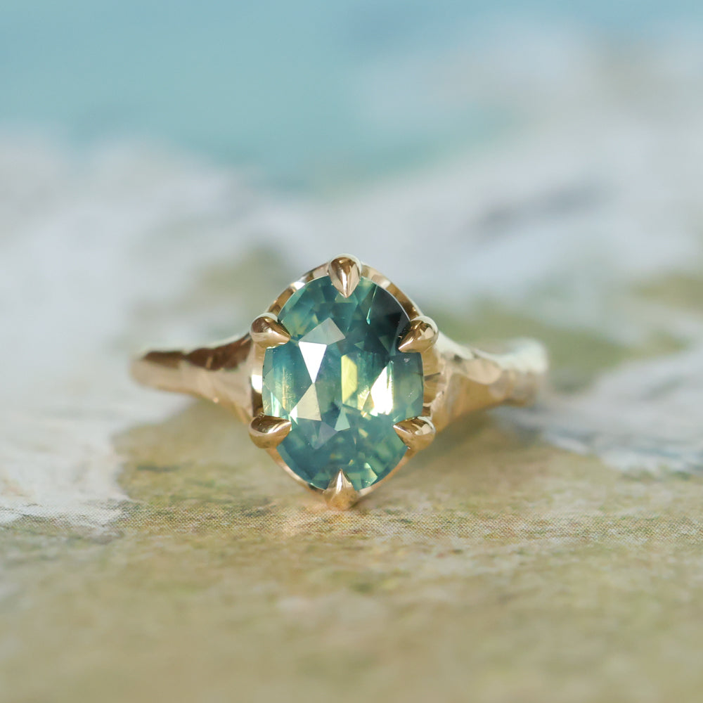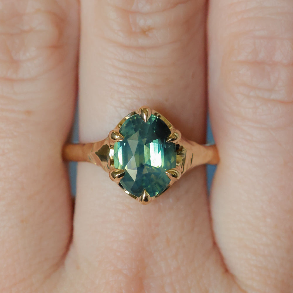 3.29ct Untreated Oval Parti Green Sapphire Low Profile 6 Prong Evergreen Carved Solitaire in 14k Yellow Gold