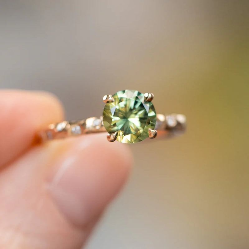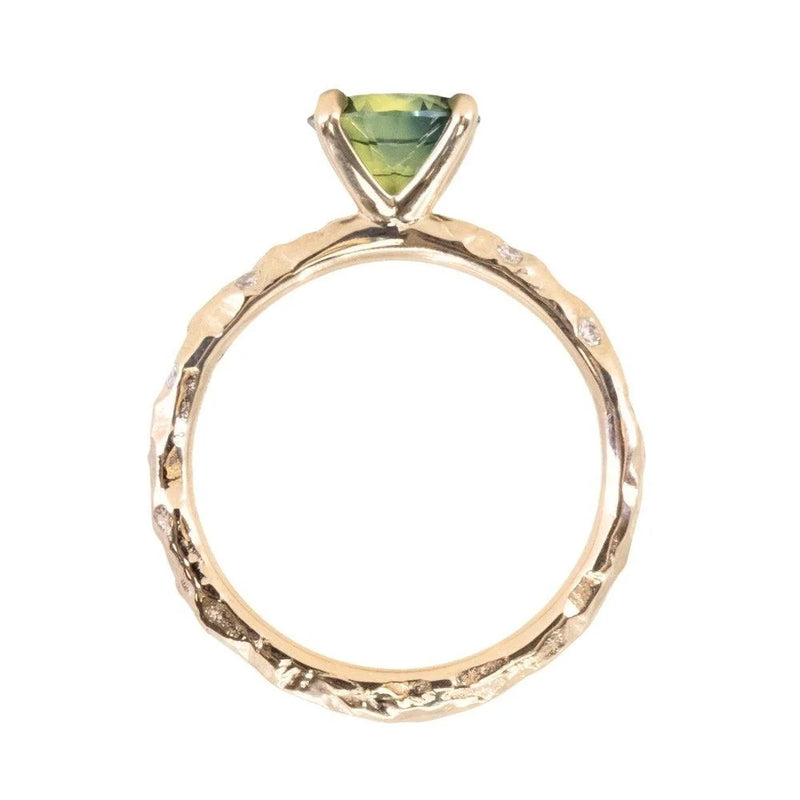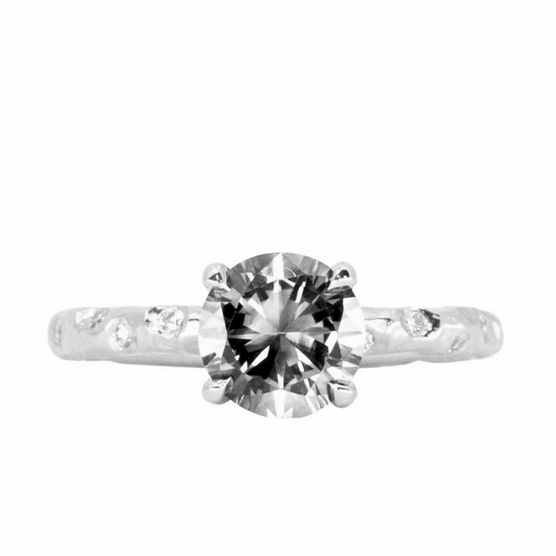 Earthy and fun! This setting features a classic 4 prong solitaire with carved texture and ten embedded diamonds in the band. This ring should be ordered in the correct size, as resizing the ring too large or too small can prove difficult.
