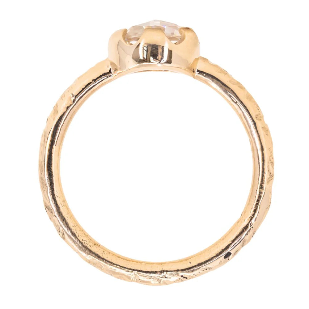Our low-profile 6-prong design is most loved for rose-cut stones, which sit beautifully with their flat base and domed top. If you choose a brilliant-cut stone, the setting will be built slightly higher to allow room for its deeper cut.