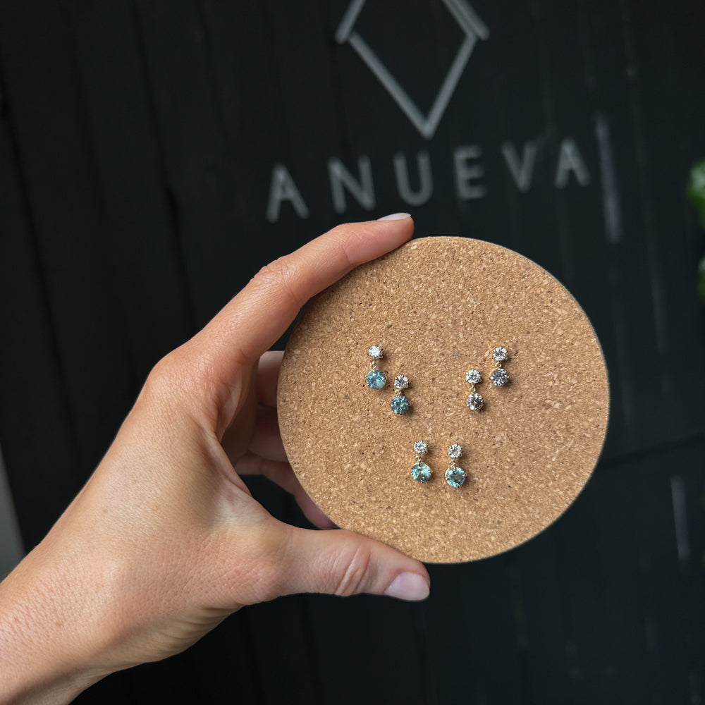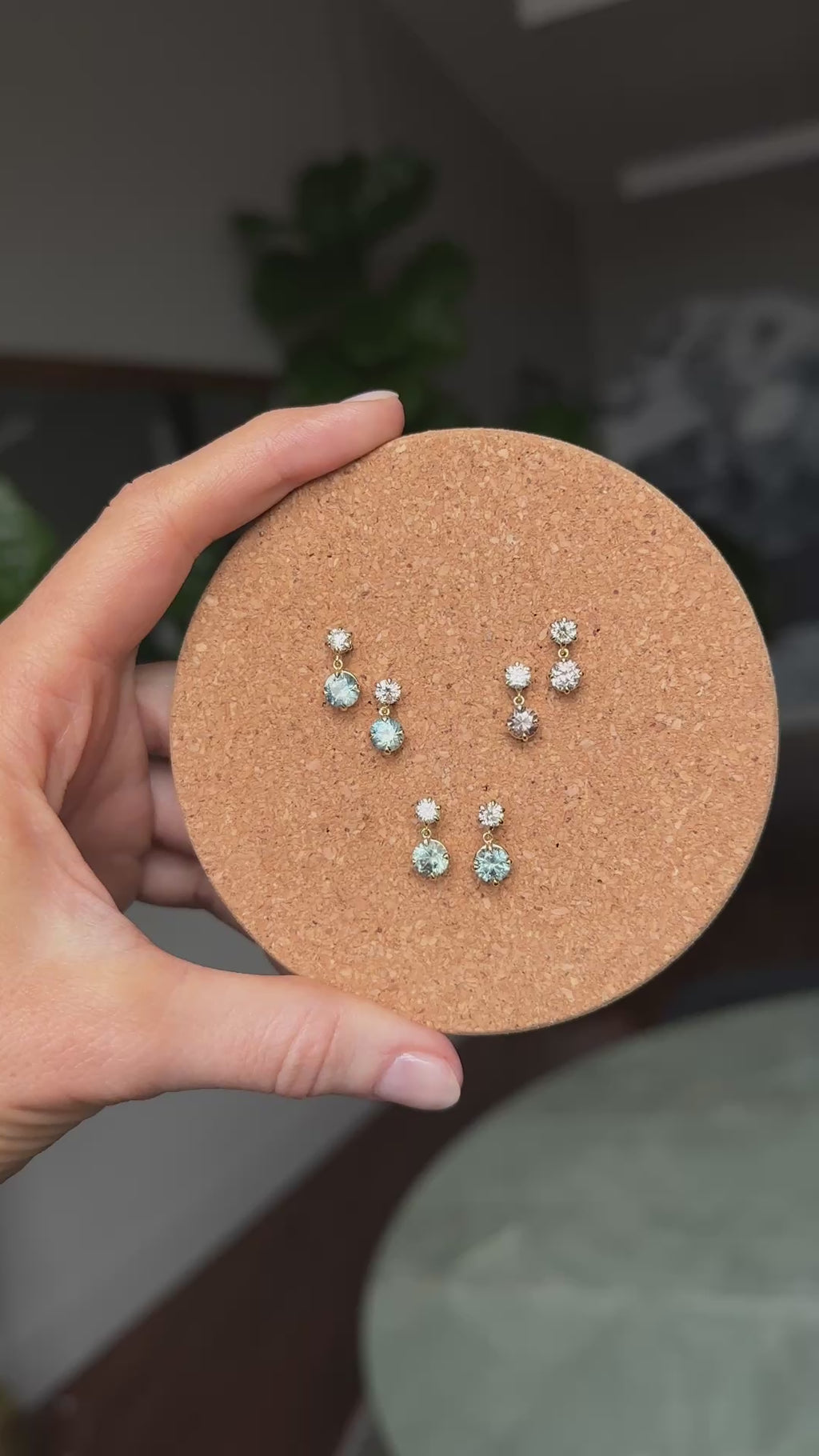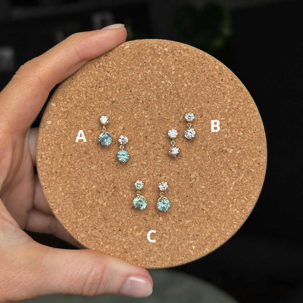 Matched (as best we can!) Montana sapphire round precision cut sapphires and 4mm lab grown diamonds, dainty and unusual "Raindrop" dangle earrings! Find them in 14k yellow gold and select your favorite pair below.