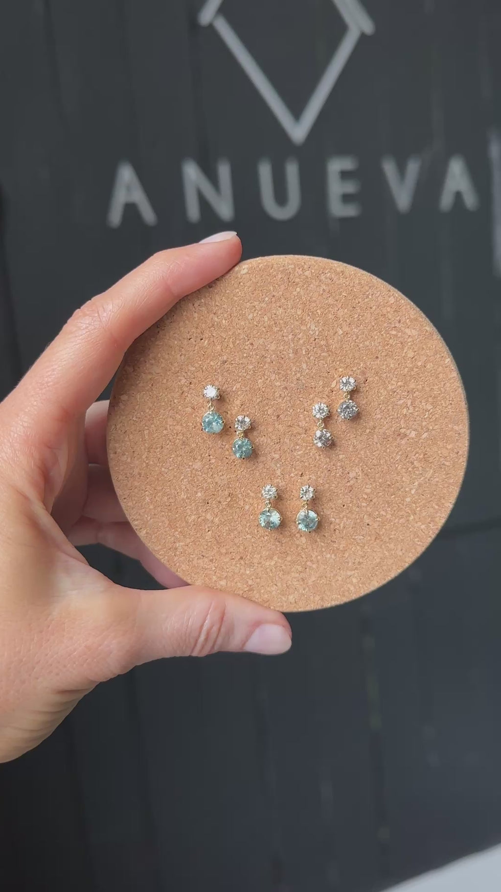 Pair A- 1.72ctw round parti teal, silky and fun heated Montana sapphires and 4mm lab grown white diamonds in 14k yellow gold. Sapphires measure 5.5-5.75mm