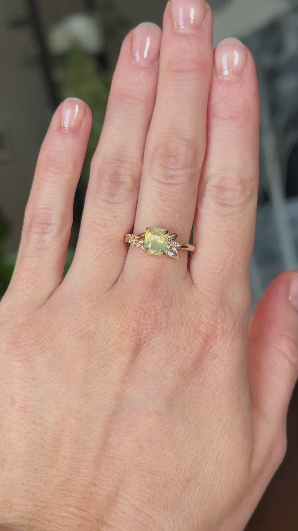 New, earthy, asymmetrical setting we're titling the "Wandering Vine!" One side is a split shank with our vine band design, and the opposing side has a gold leaf and diamond petals, set with natural white diamonds.